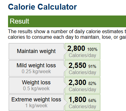 Možemo vidjeti kako ova osoba mora dnevno unositi 2.300 kalorija, ako želi izgubiti pola kile masnog tkiva tjedno