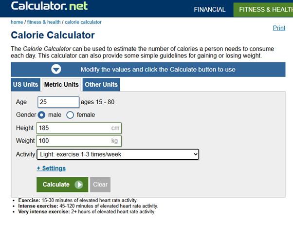 Zatim ćete ispuniti polja svojim podatcima; u ovom primjeru sam ukucao Muškarca od 25 godina, 185cm visine i 100 kilograma, koji trenira 30ak minuta 1-3x tjedno.